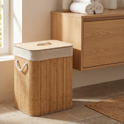 Fabricado en bambú natural con estructura rígida, es liviano pero resistente. Su tapa ayuda a mantener la ropa fuera de la vista, aportando una sensación de limpieza visual y evitando que se dispersen olores.