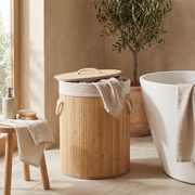 Este cesto para ropa redondo de bambú es la combinación perfecta entre funcionalidad y estética. Su forma cilíndrica aporta un look más fluido y decorativo, ideal para baños, dormitorios o lavaderos con estilo natural, nórdico o Japandi.